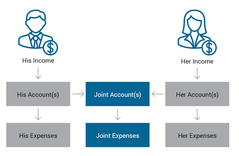 In this approach, all your household income is pooled into a joint account (or multiple joint accounts). All your expenses flow out of this account. This simple process keeps everything very transparent and relatively easy to manage. Some couples have one of the partners as the primary financial manager who handles the bills every month. That’s okay, but remember that you’re in it together. Find a way to keep each other involved in money decisions, and don’t let all the financial burdens fall onto one person's shoulders.